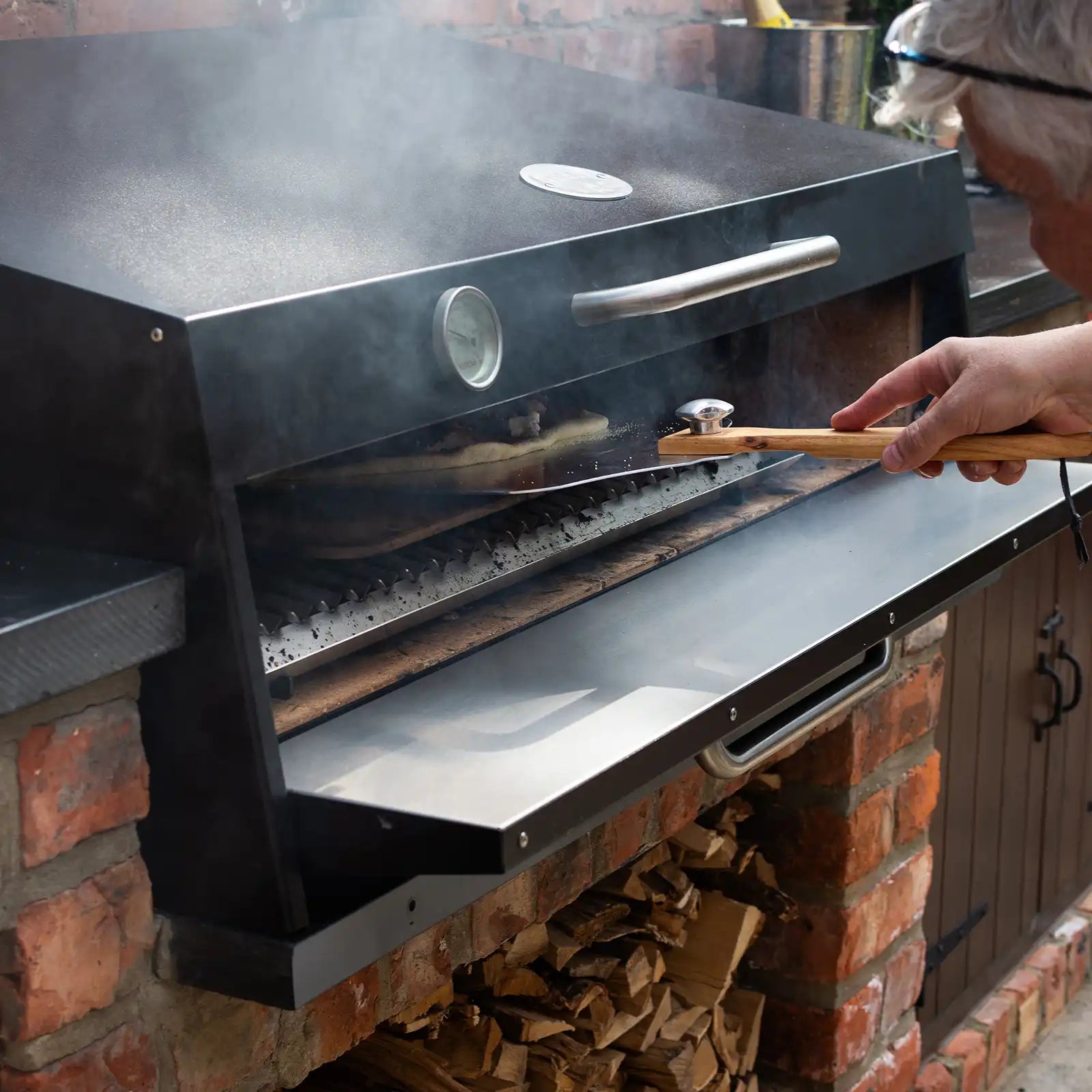The trolley has a traditional BBQ style with sturdy locking castors and handles, allowing you to move your grill to the best spot in your outdoor space. The base doubles as wood storage and includes hanging hooks for your BBQ tools, ensuring you have everything you need within arm’s reach.